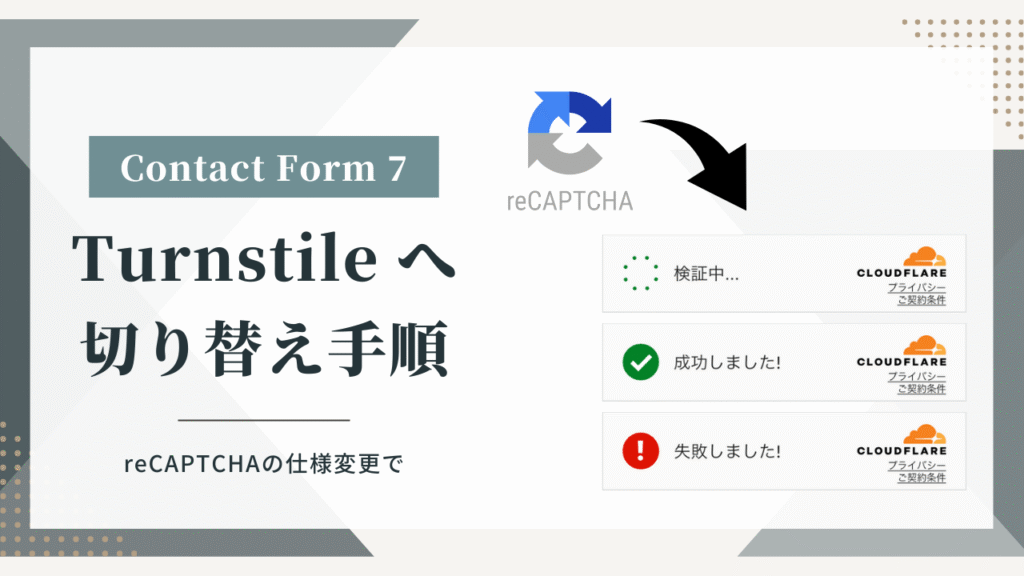 IT全般 Contact Form 7でreCAPTCHAからCloudflare Turnstileへ切り替える方法 Contact Form 7でのスパム対策を強化!プラグイン不要でreCAPTCHAからCloudflare Turnstileに切り替える手順を画像付きで解説。WordPress初心者でも簡単に設定可能で、プライバシー保護・表示速度改善にも対応。 2025.08.31 IT全般