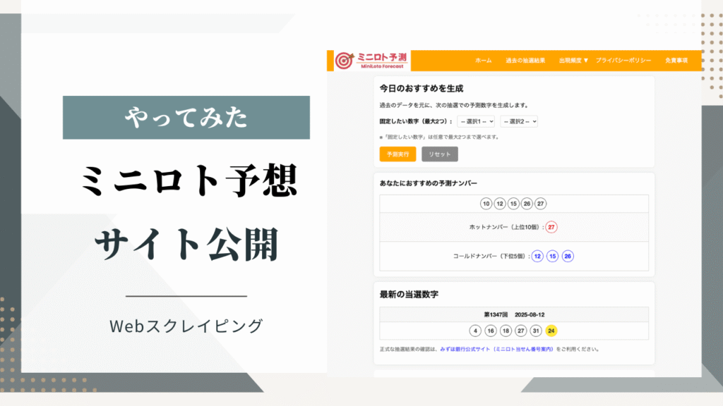 IT全般 ミニロト出現数字の傾向をチェックできるサイトを公開しました ミニロト出現数字の統計サイトを公開しました。よく出る数字や予測機能を搭載し、数字選びの参考に。SEOやAI分析の実証実験も兼ねています。 2025.08.19 IT全般