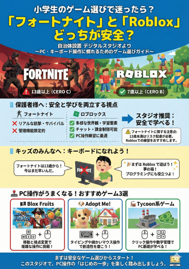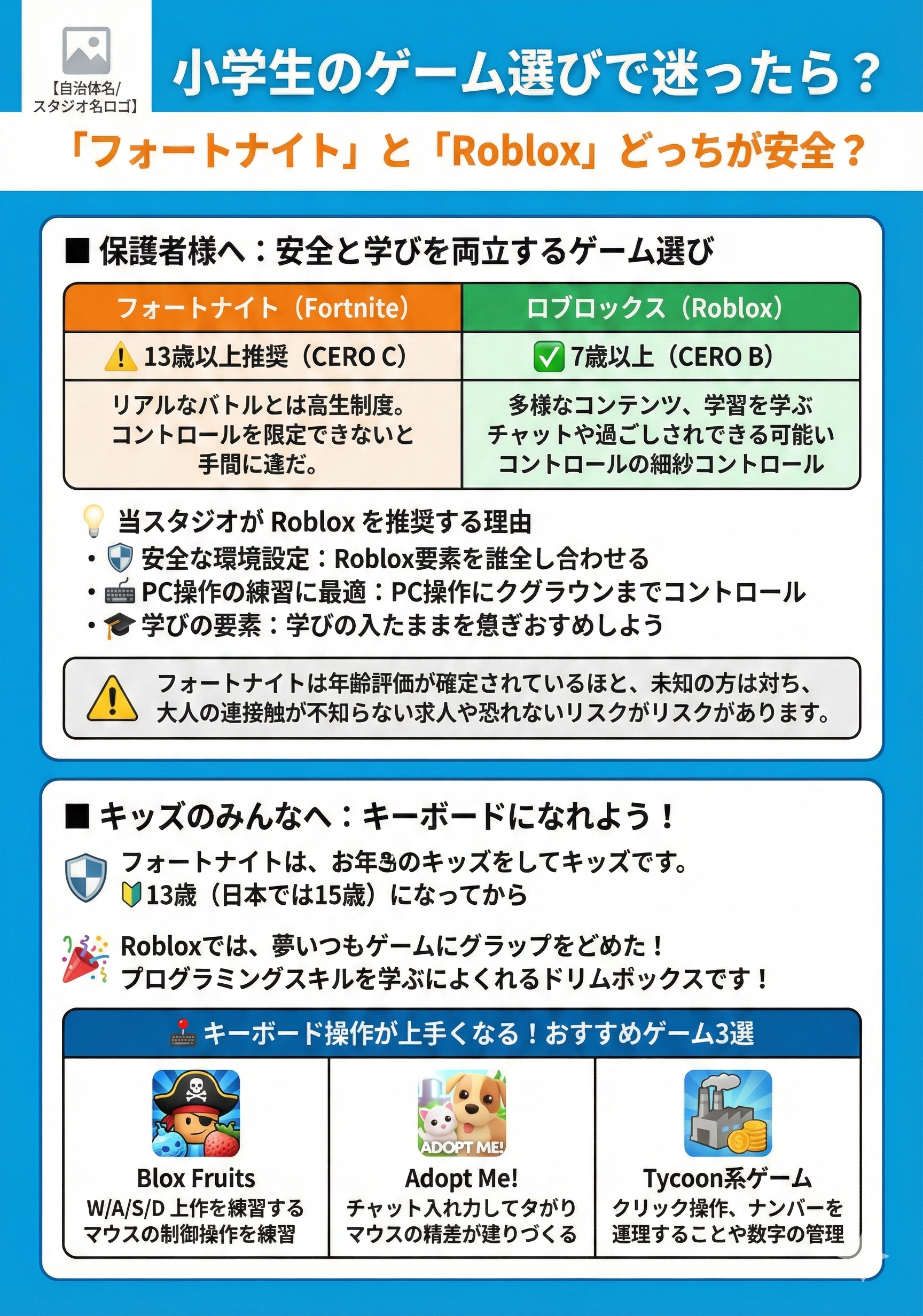 - 保護者への情報提供: なぜフォートナイトは不適切で、Robloxが安全なのか。管理機能の違いを明確にする。