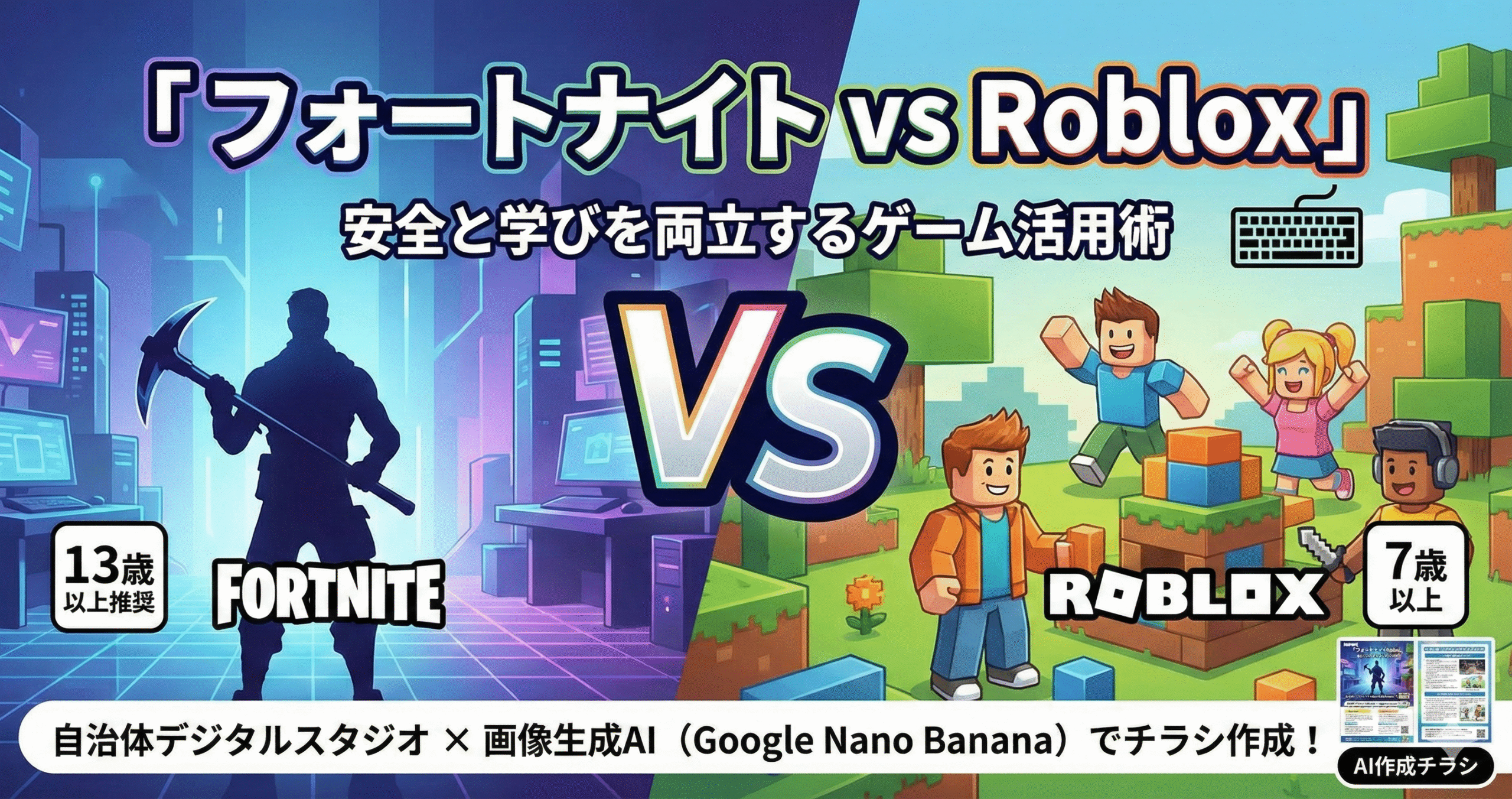 このチラシは、画像生成AIの力を借りて、単なるゲームの紹介に留まらず、「自治体が提供する公の施設として、子どもたちの安全と成長に責任を持つ」という姿勢を示すツールとして生まれ変わりました。