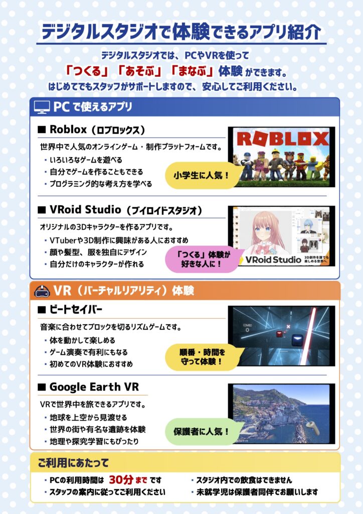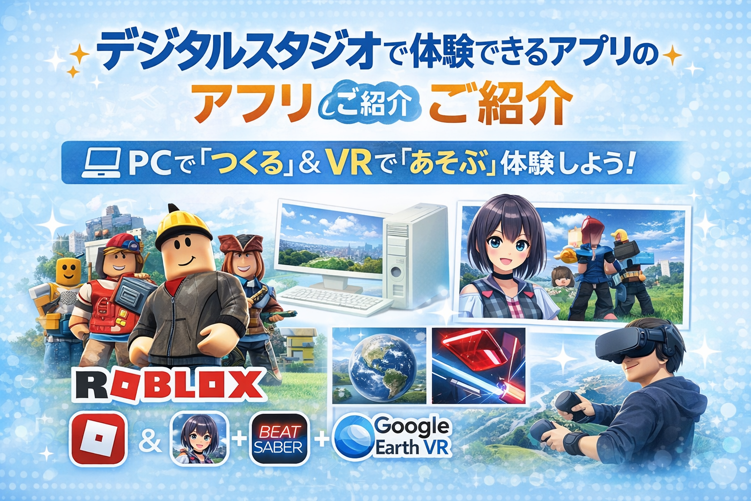 デジタルスタジオでは、PCやVRを使って「つくる」「あそぶ」「まなぶ」体験ができます。