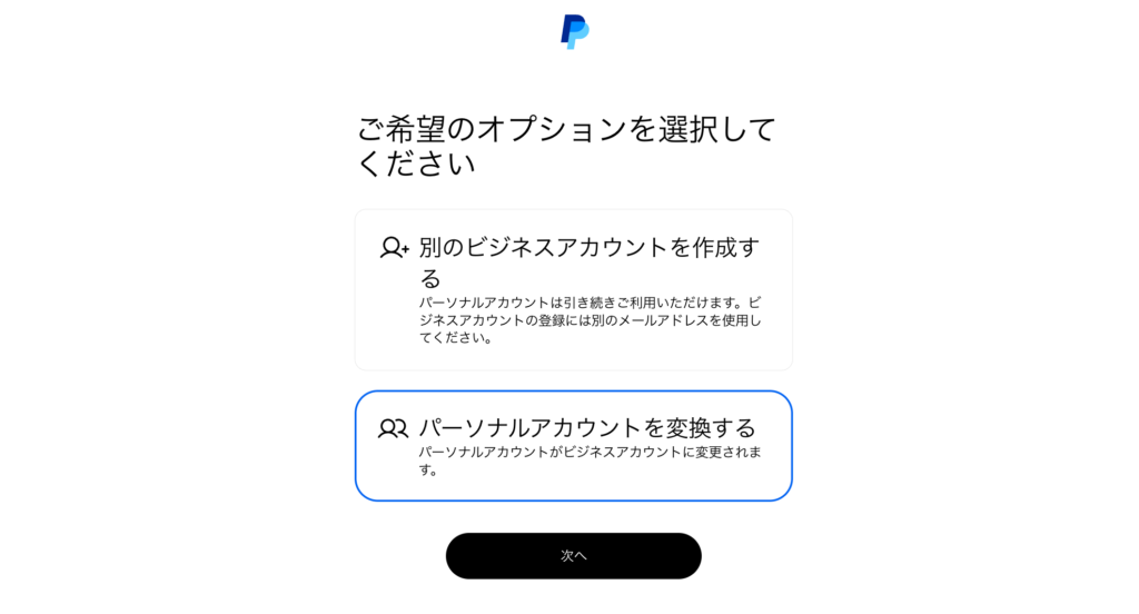 PayPalは新規にビジネスアカウントを作成する方法だけでなく、既存の個人アカウントをアップグレードする方法も用意されています。
