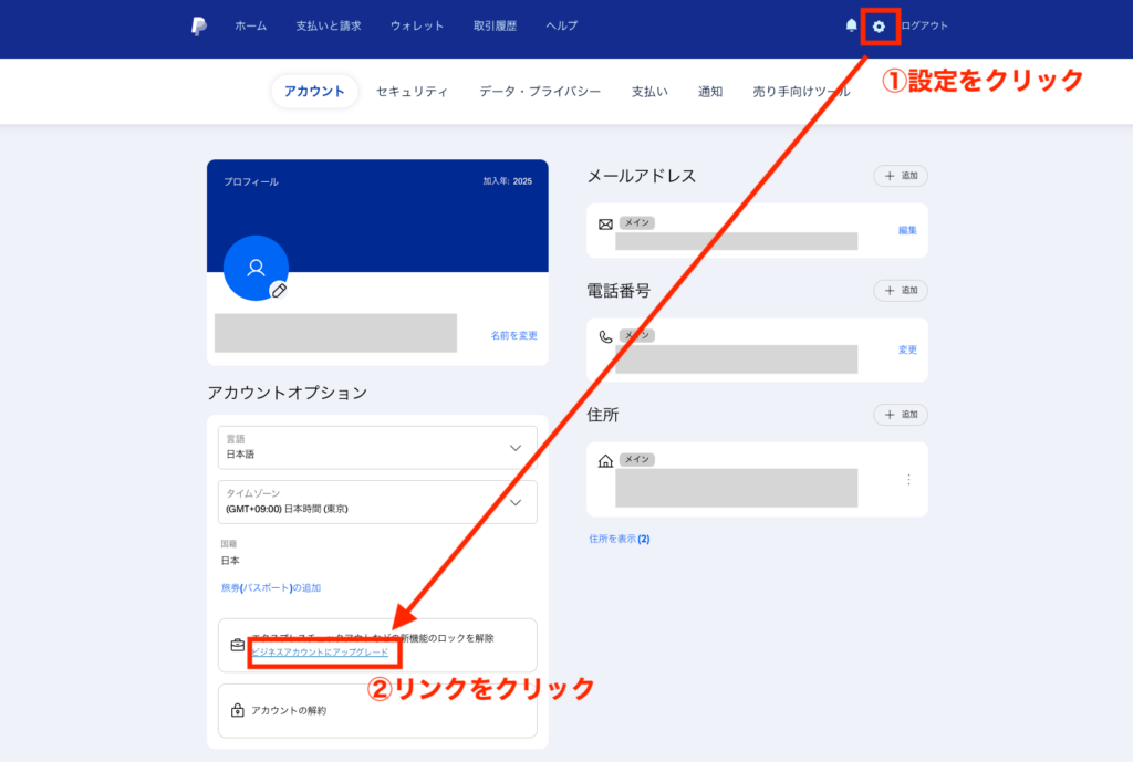 PayPalに個人アカウントでログインすると、ホーム画面→設定(歯車アイコン)内に