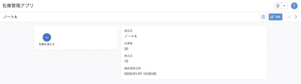 入出庫作業をスムーズにするため、「在庫を 1 減らし、最終更新日時を自動更新する」ボタンを作成します。