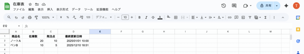 | ペンB | 5 | 10 | 2025/01/01 10:00 |