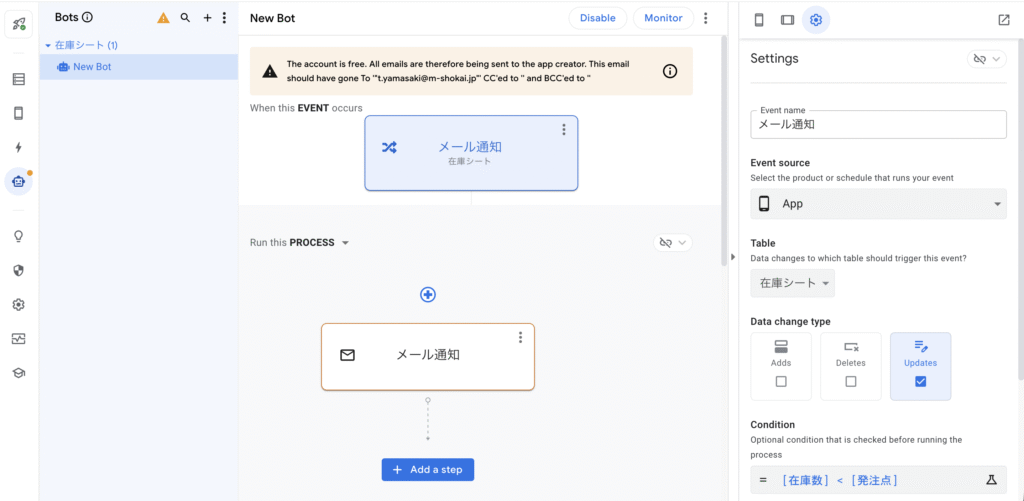 この内容で、在庫が閾値を下回った瞬間にメール通知が飛ぶようになります。