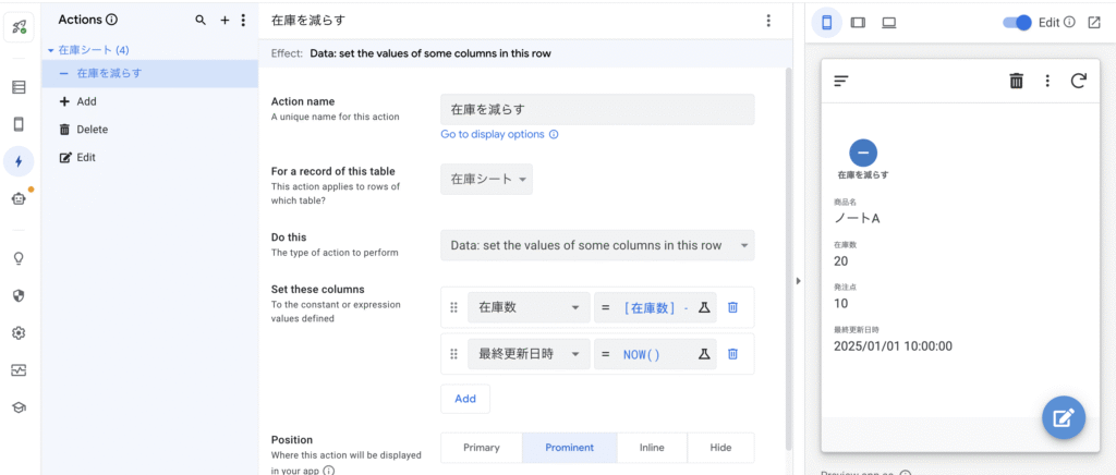 後で作成する「在庫減算ボタン(アクション)」でこの列を書き換えるため。