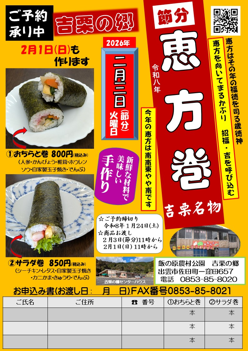 三島笑会の代表が運営に携わっている地域交流施設「吉栗の郷」では、節分にあわせた恵方巻きの予約販売を行っています。