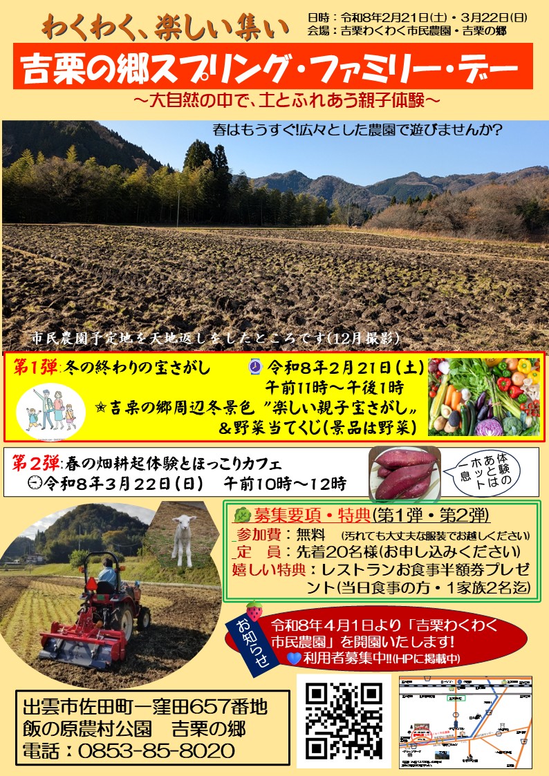 出雲市佐田町にある「吉栗の郷」で、親子で楽しめる体験イベント「吉栗の郷 スプリング・ファミリーデー」 が開催されます。